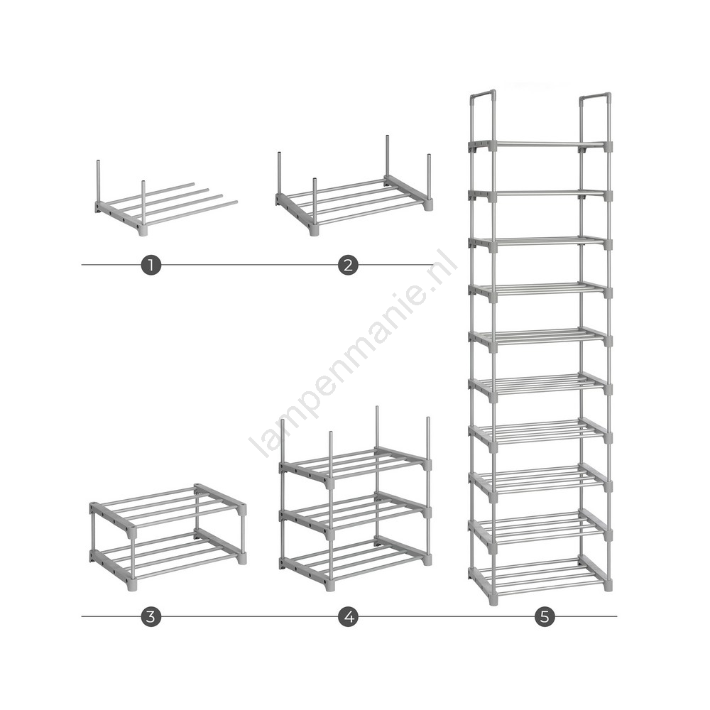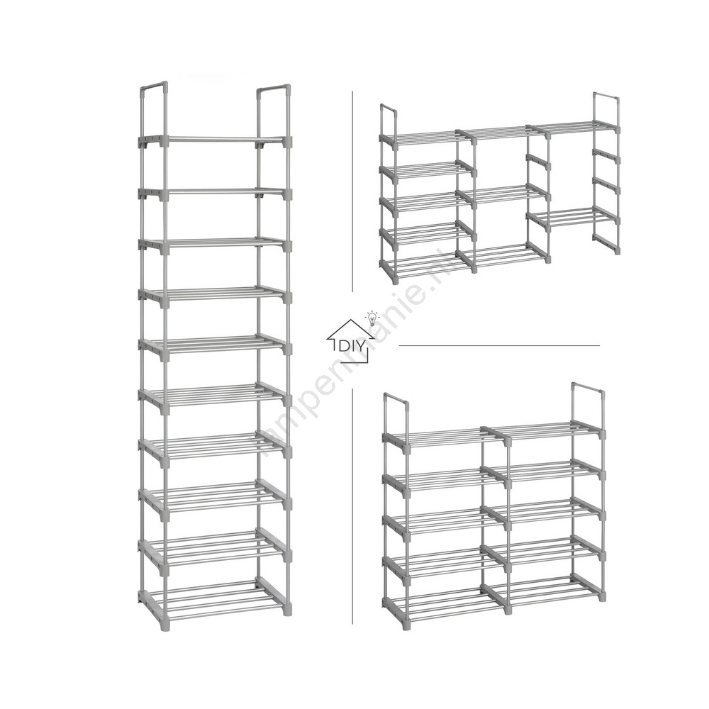 • Stevige metalen buizen, verbonden met hoogwaardige koppelingen, vormen een robuust schoenenrek.