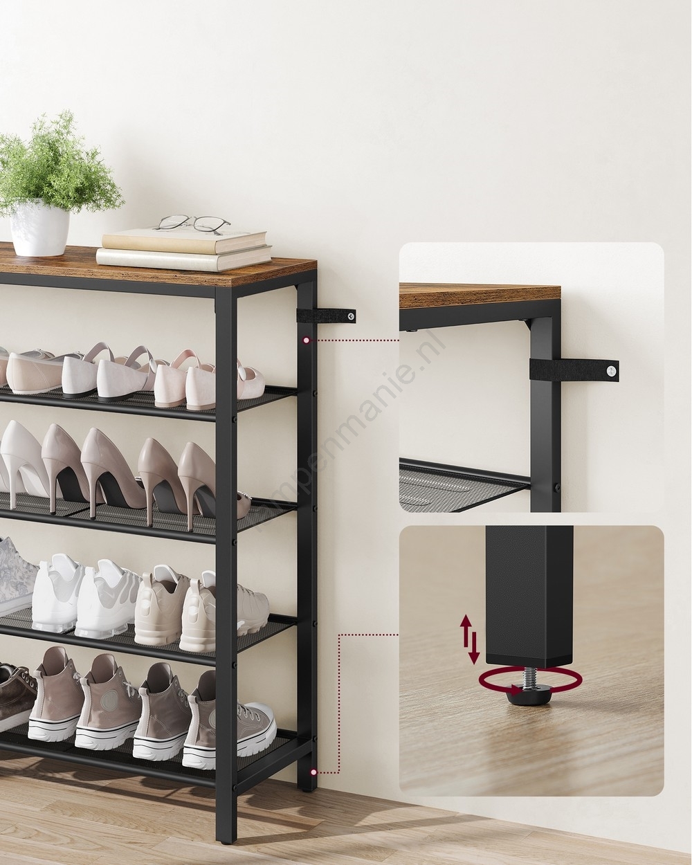 • Dankzij zijn slanke vorm neemt dit 5-laags schoenenrek weinig vloeroppervlak in beslag en biedt het toch voldoende opbergruimte.