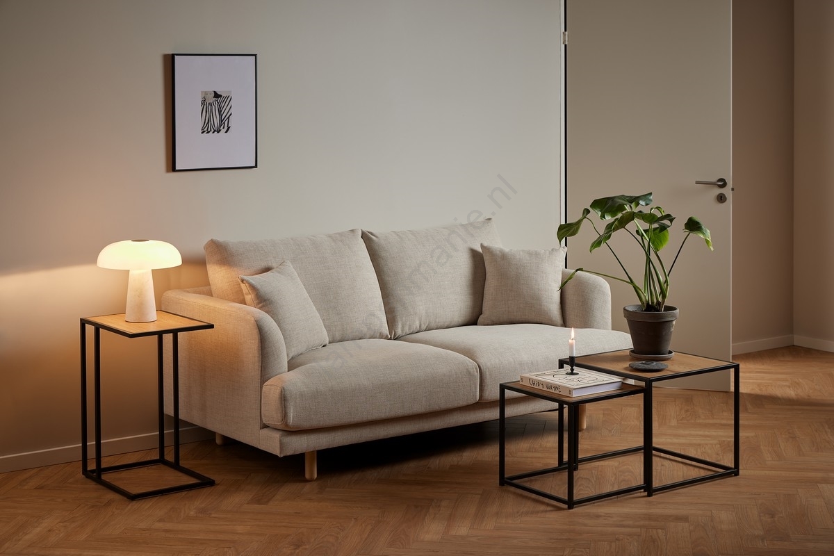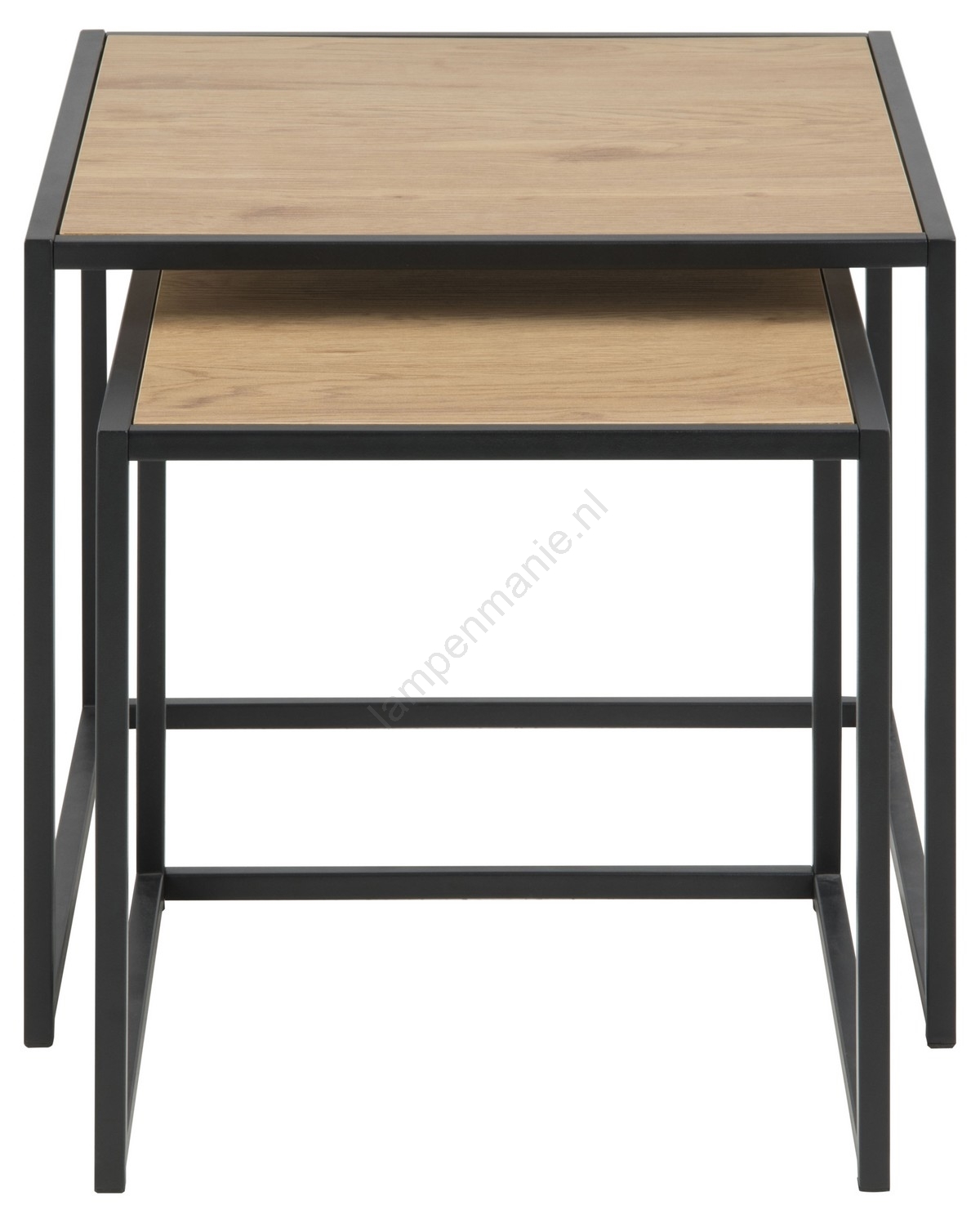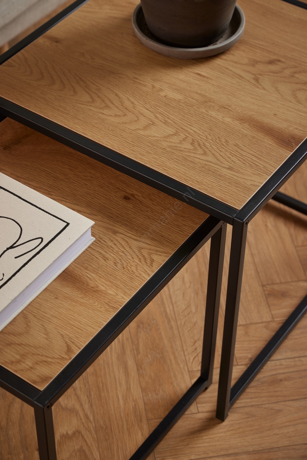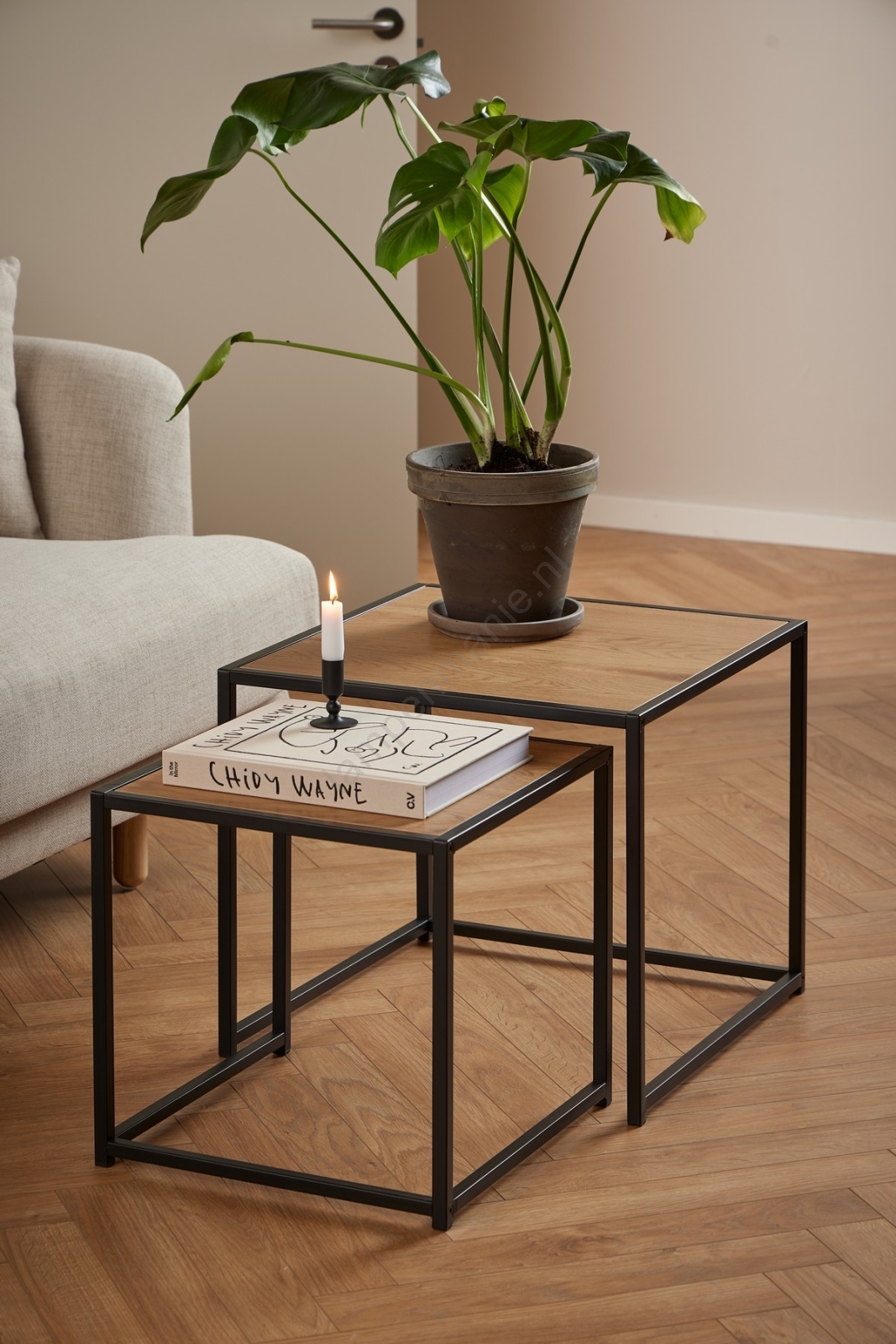 • De set tafels valt op door het opvallende houtnerf-effect en wordt ondersteund door een metalen onderstel met een gepoedercoate afwerking.