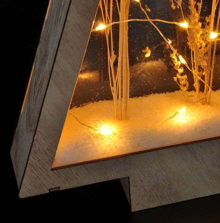• Natuurlijke, houten kerstdecoratie in de vorm van een kerstboom met winterbloemen bedekt met sneeuw.