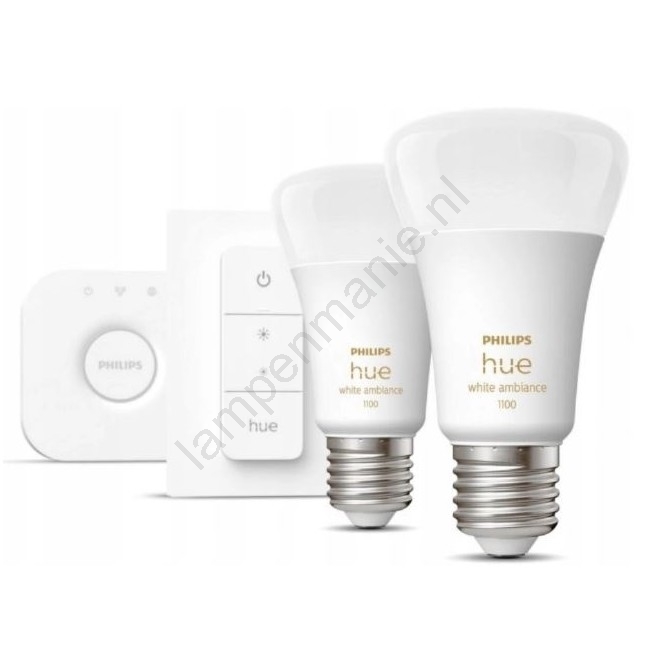 • De set bevat een verbindingsapparaat Hue Bridge, een wand Dimmer Switch en twee White Ambience lampen.