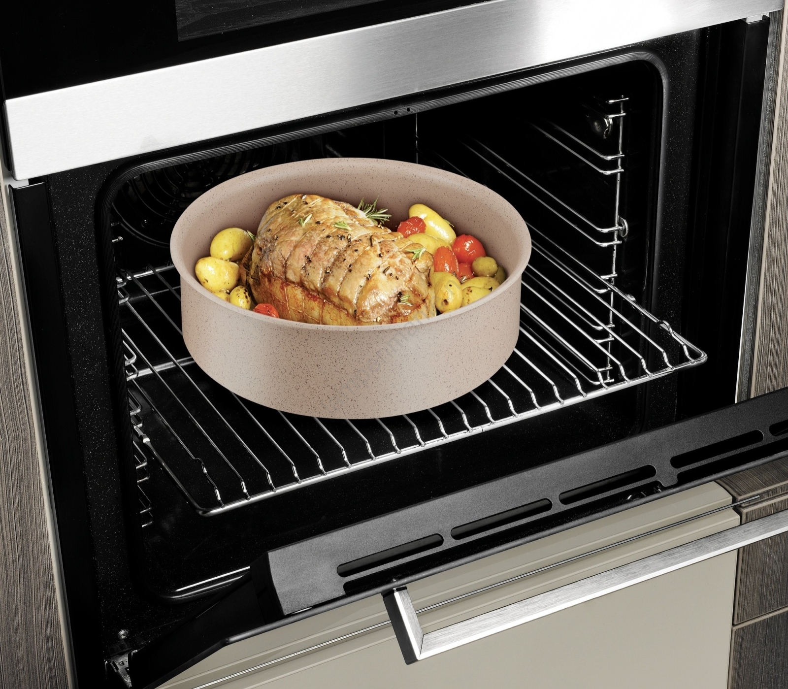 • Het ontwerp is voorzien van een afneembare handgreep, waardoor efficiënt opbergen, ovengebruik en serveren zonder handgreep mogelijk zijn.