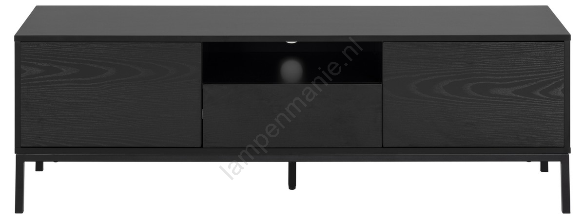 • Bovenblad en frame van MDF met zwarte PU-lak, 2 deuren en een lade van zwart grof melamine, onderstel van mat zwart gepoedercoat staal met metalen geleiders.