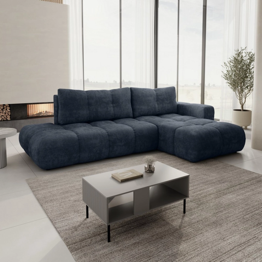 • ALMADA L‑vormige gestoffeerde hoekbank met slaapfunctie en opbergruimte, linkeropstelling, blauw