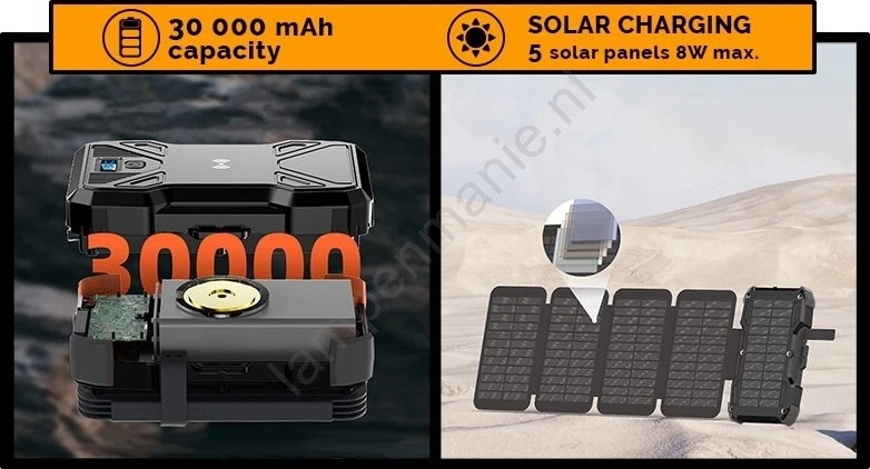 • Powerbank met een capaciteit van 30000 mAh, met zonne- en draadloos opladen en een ingebouwde LED-zaklamp.