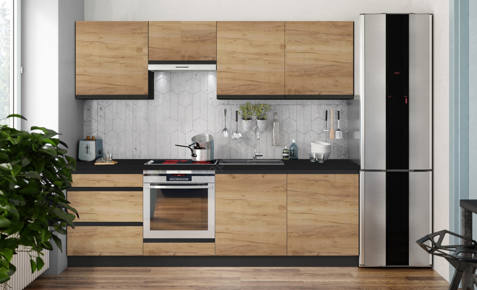 • Breng de charme van hout en de elegantie van dit keukenblok in huis, dat de nadruk legt op strakke lijnen en een tijdloze uitstraling.