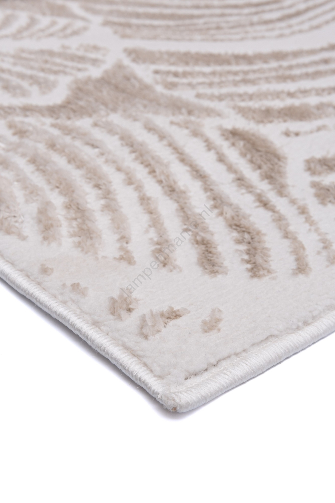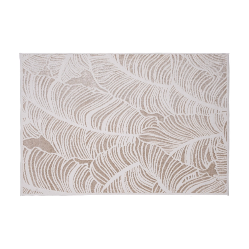 • Een zacht beige vloerkleed met een bescheiden bladpatroon geeft elke ruimte een vleugje lichtheid en gezelligheid.