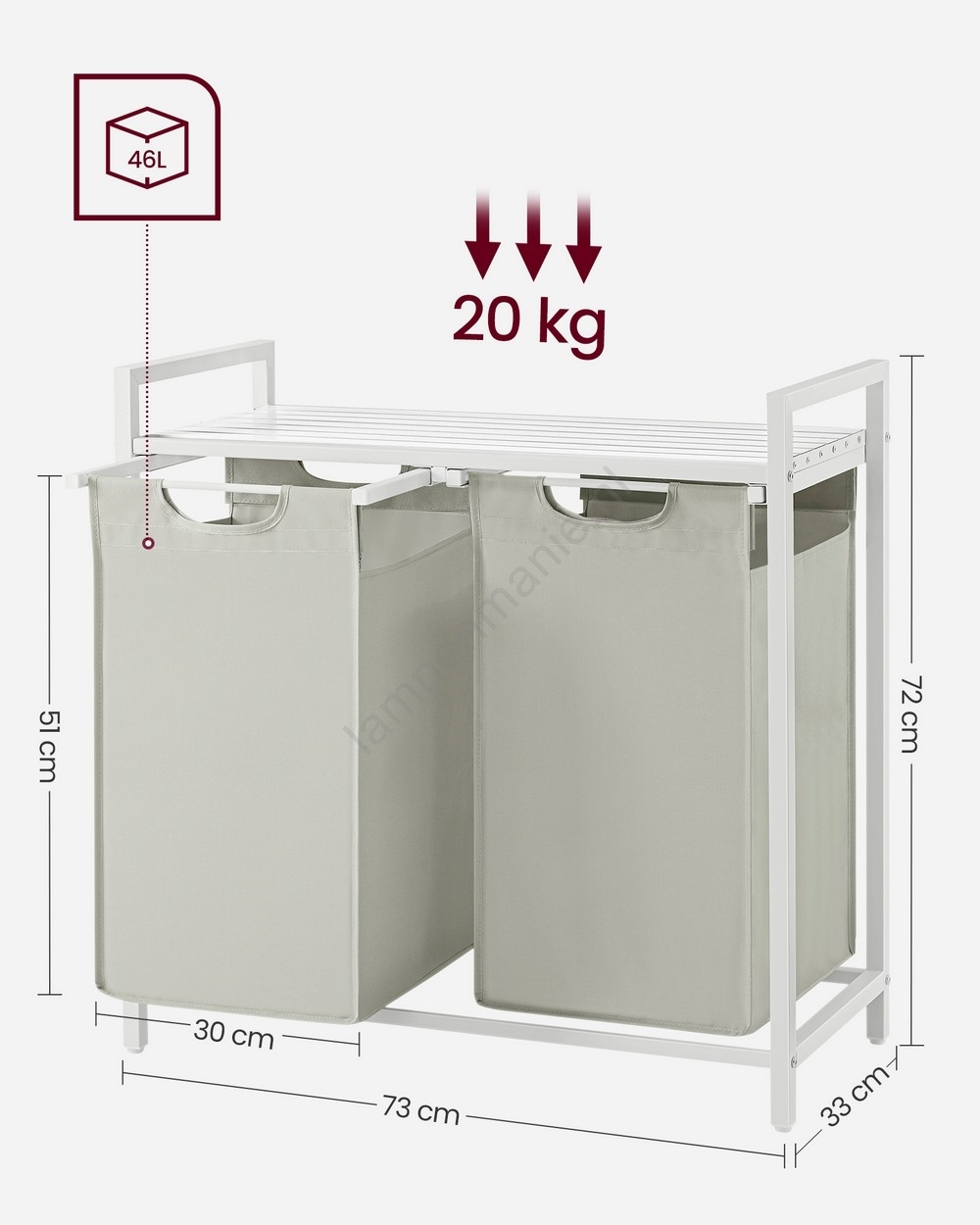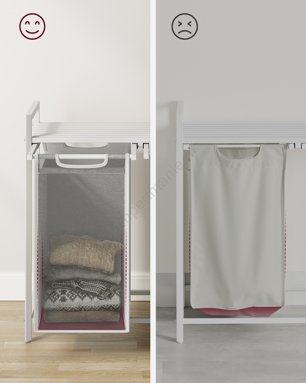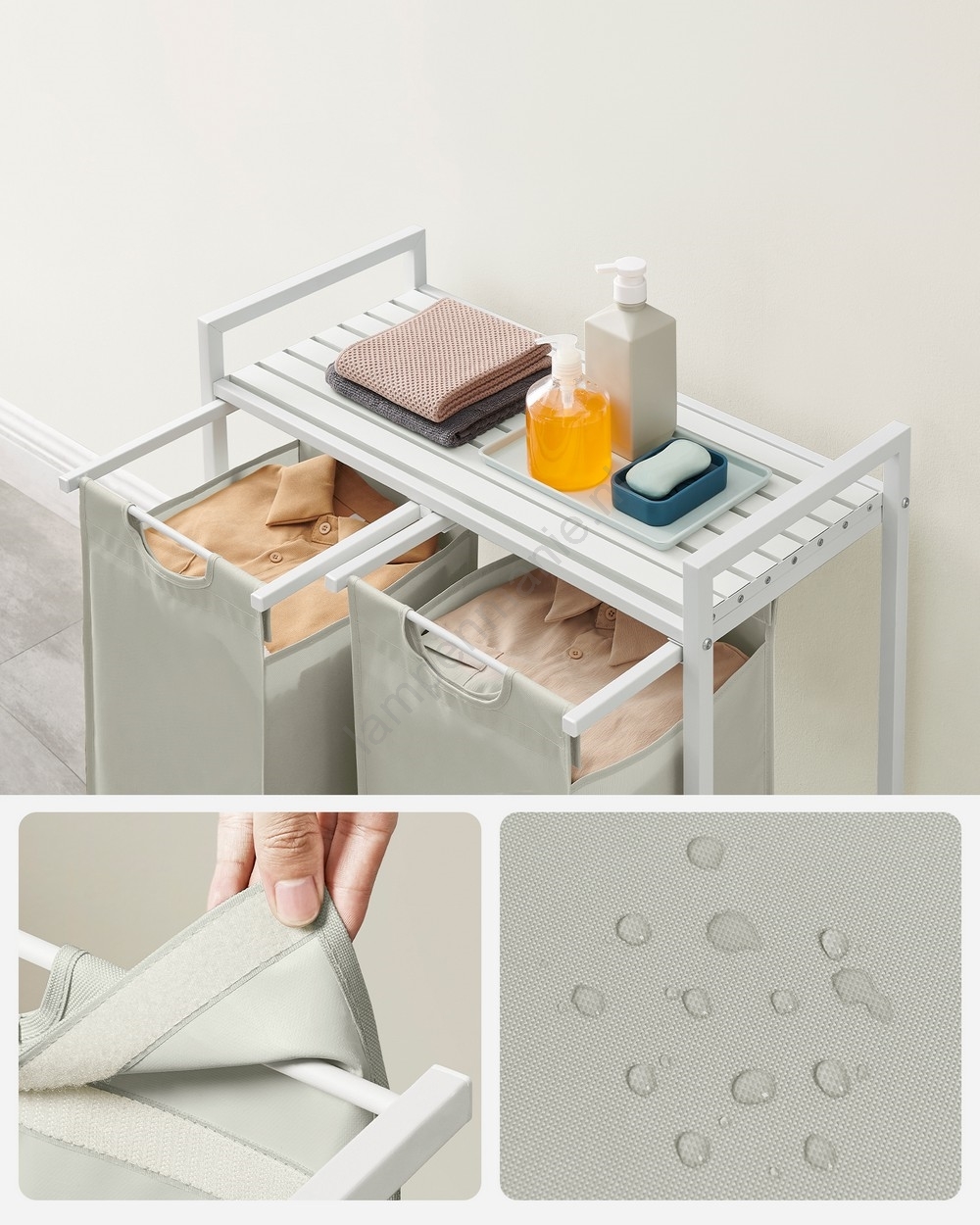 • 2 zakken, 1 plank – Sorteer uw was in de twee stoffen zakken (46 l per zak) en plaats wasmiddelen, wasverzachter en andere spullen op de plank.