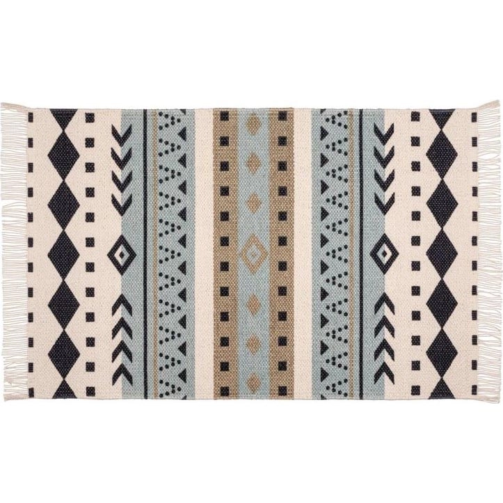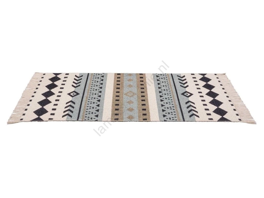 • Stijlvol etno-design met geometrische patronen in blauw, beige en zwart.