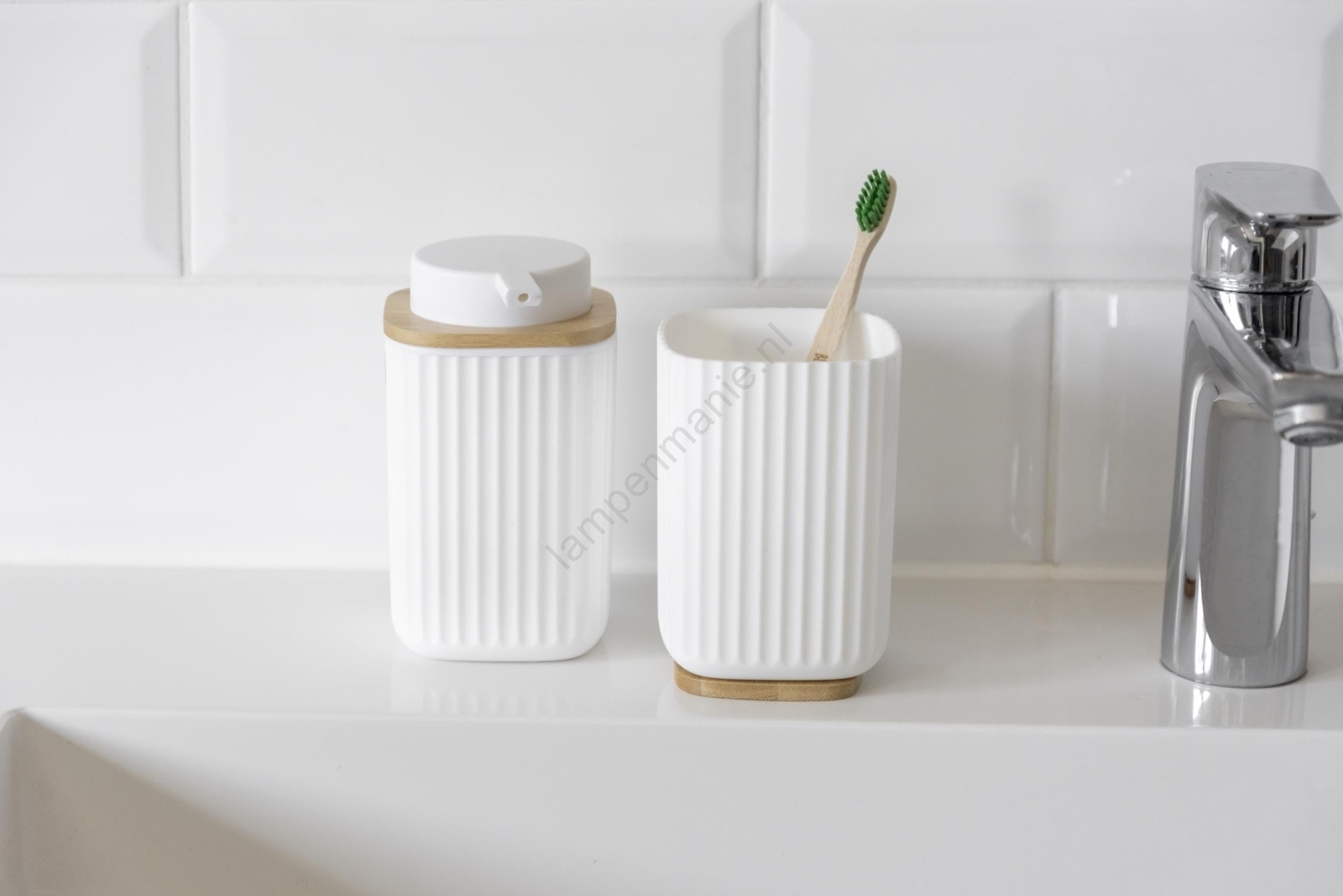 • Elegante tandenborstelbeker in modern wit met een onderzijde van bamboe.