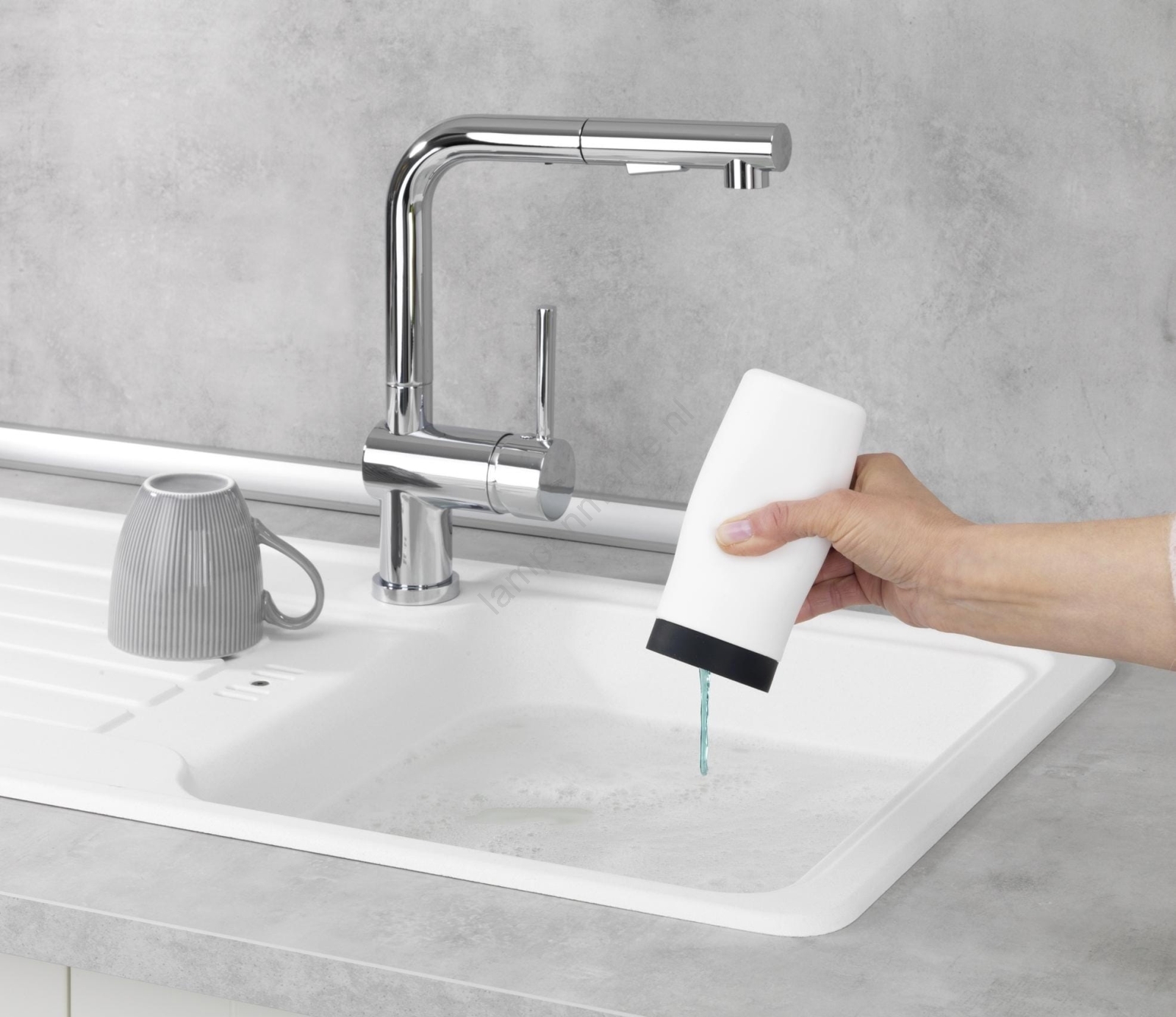 • Praktische doseerder voor afwasmiddel met eenvoudige bediening door in te drukken.