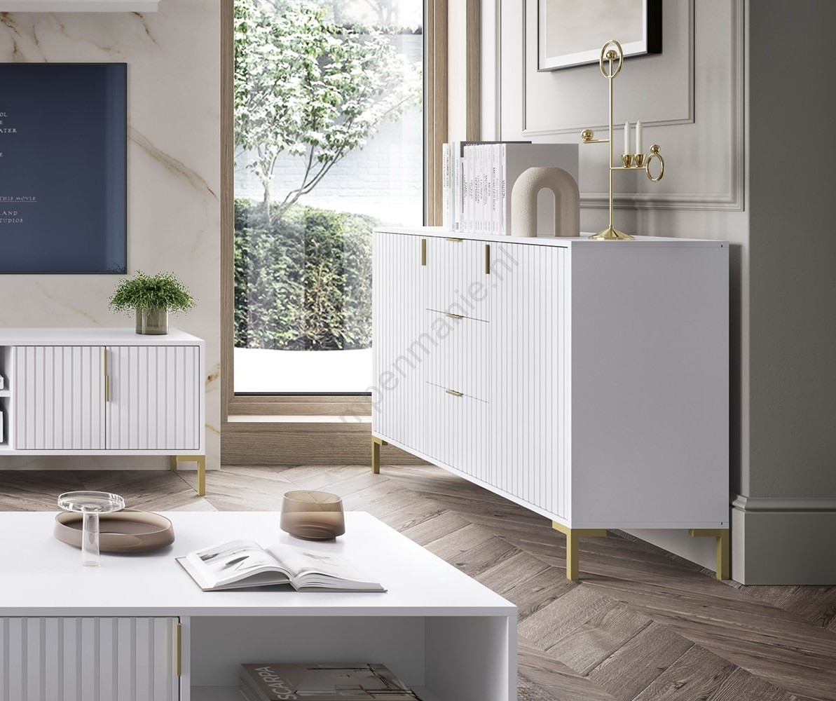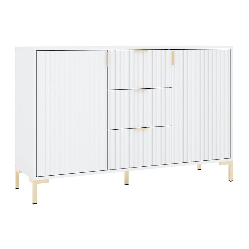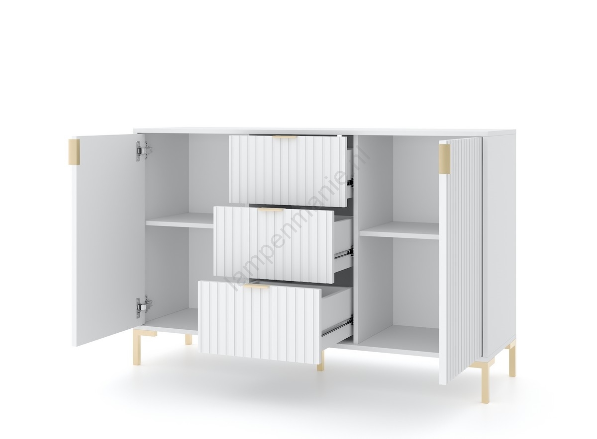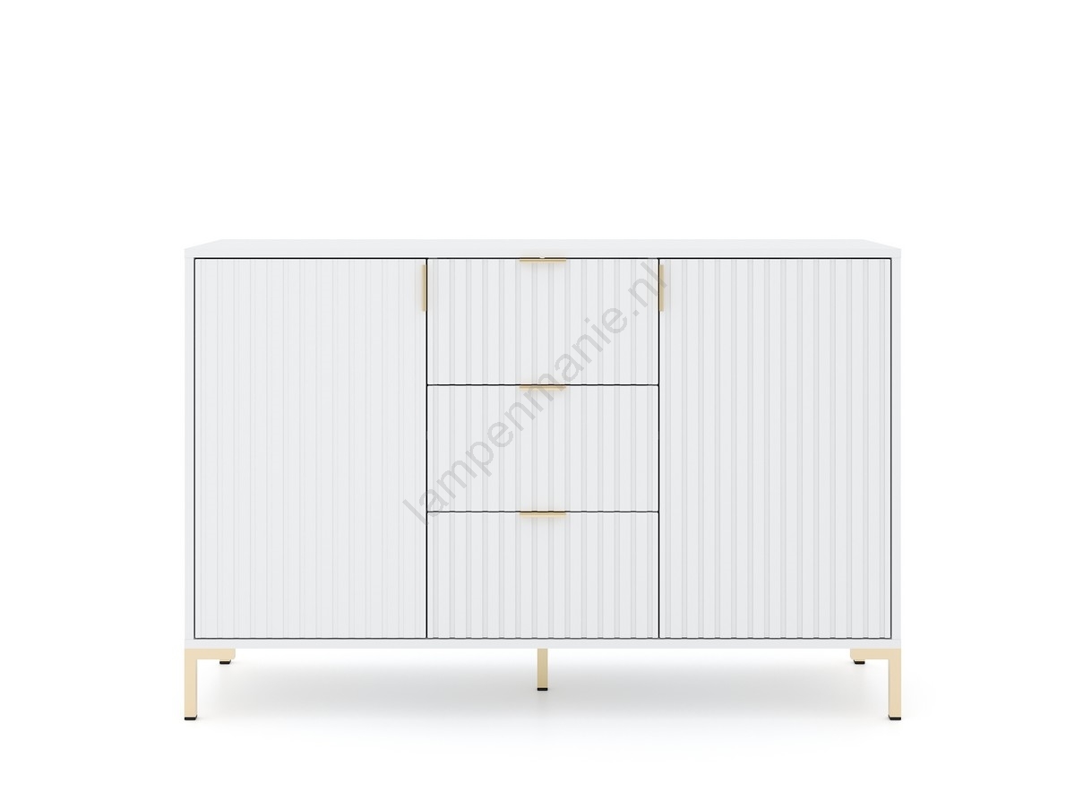 • Voorzien van vier legplanken, twee deuren en drie laden met verticaal geribde fronten.
