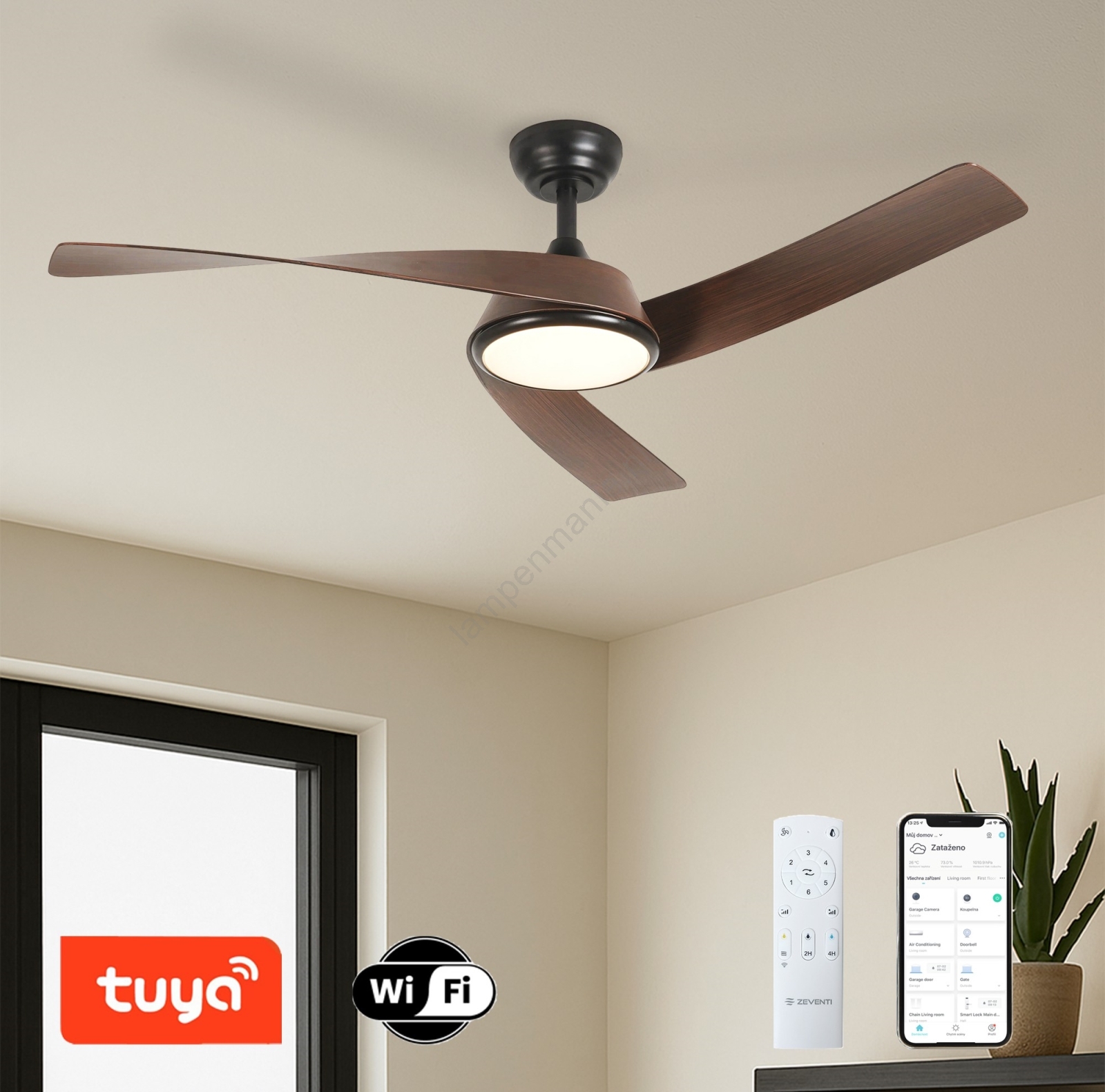 ZEVENTI - Dimbare LED-plafondventilator AERYS LED/24W/230V 3000/4000/6000K Wi-Fi Tuya zwart/walnoot + afstandsbediening