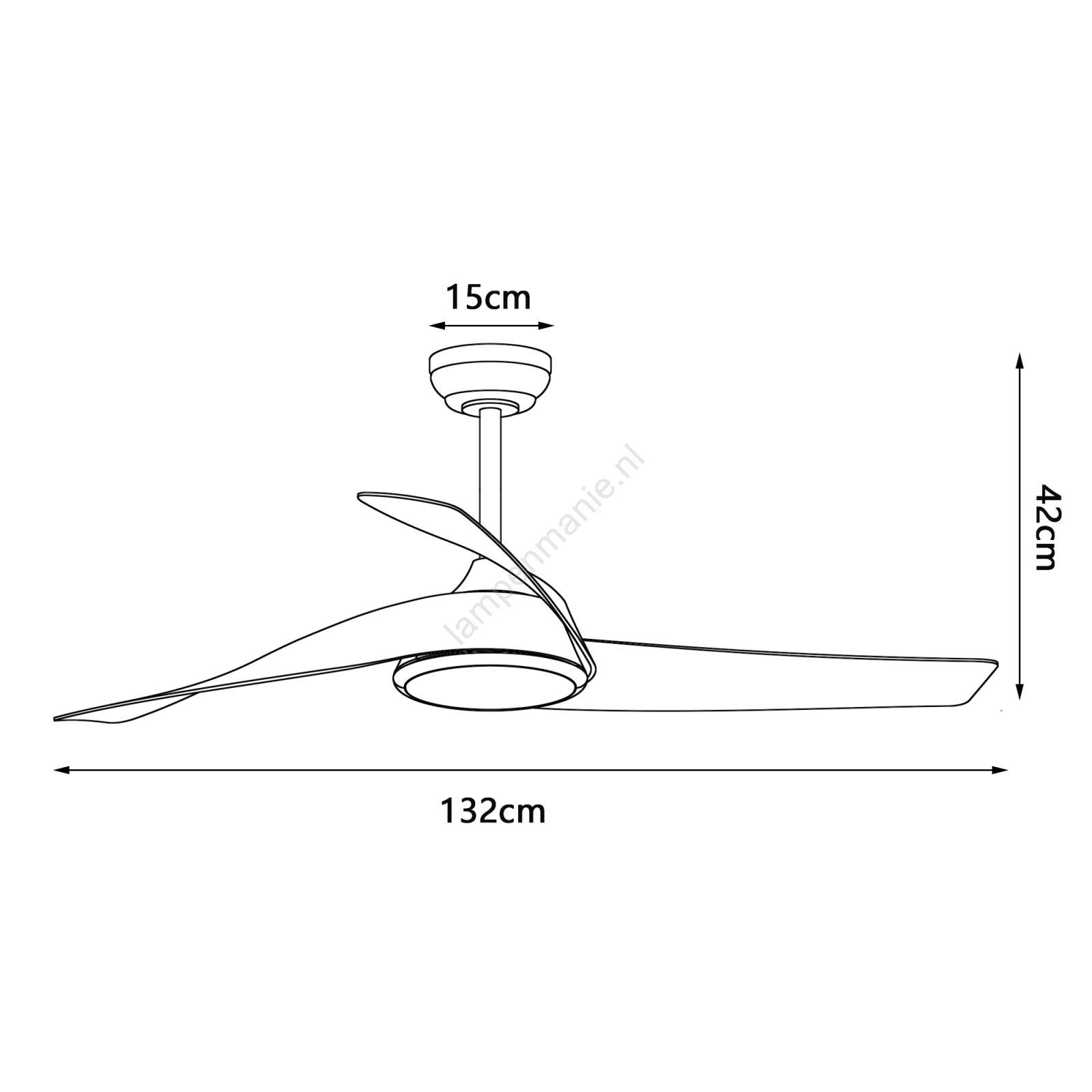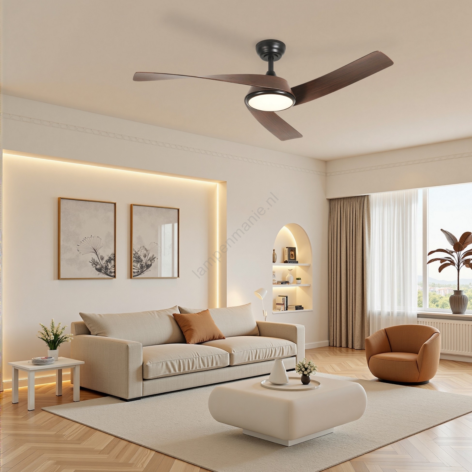 • Plafondventilator met LED-verlichting verfrist de ruimte op hete zomerdagen.